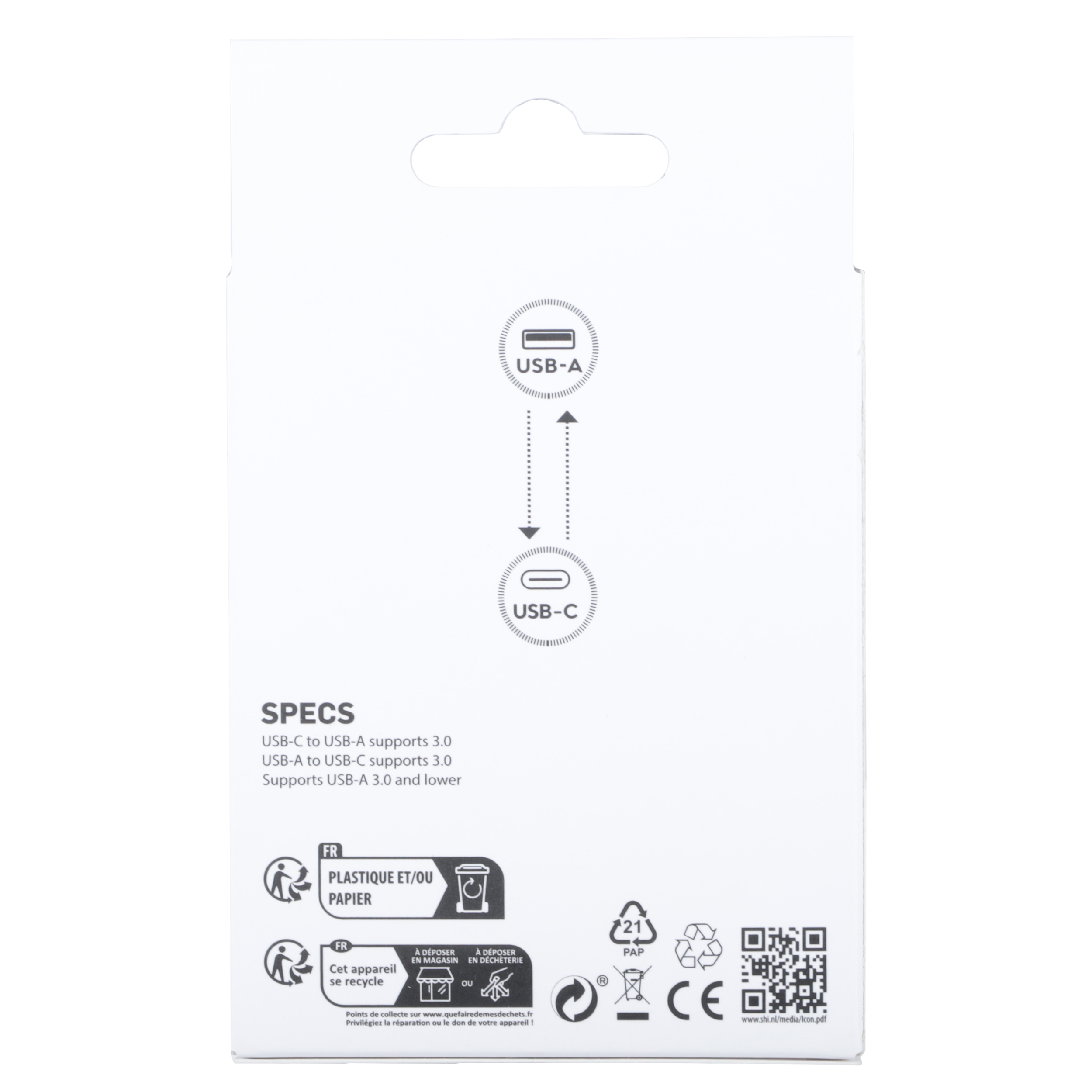 Set van twee USB-C adapters: een USB-A naar USB-C en een USB-C naar USB-A. Geschikt voor het aansluiten van apparaten met verschillende USB-aansluitingen. Handig voor opladen en gegevensoverdracht. Compact en eenvoudig mee te nemen.