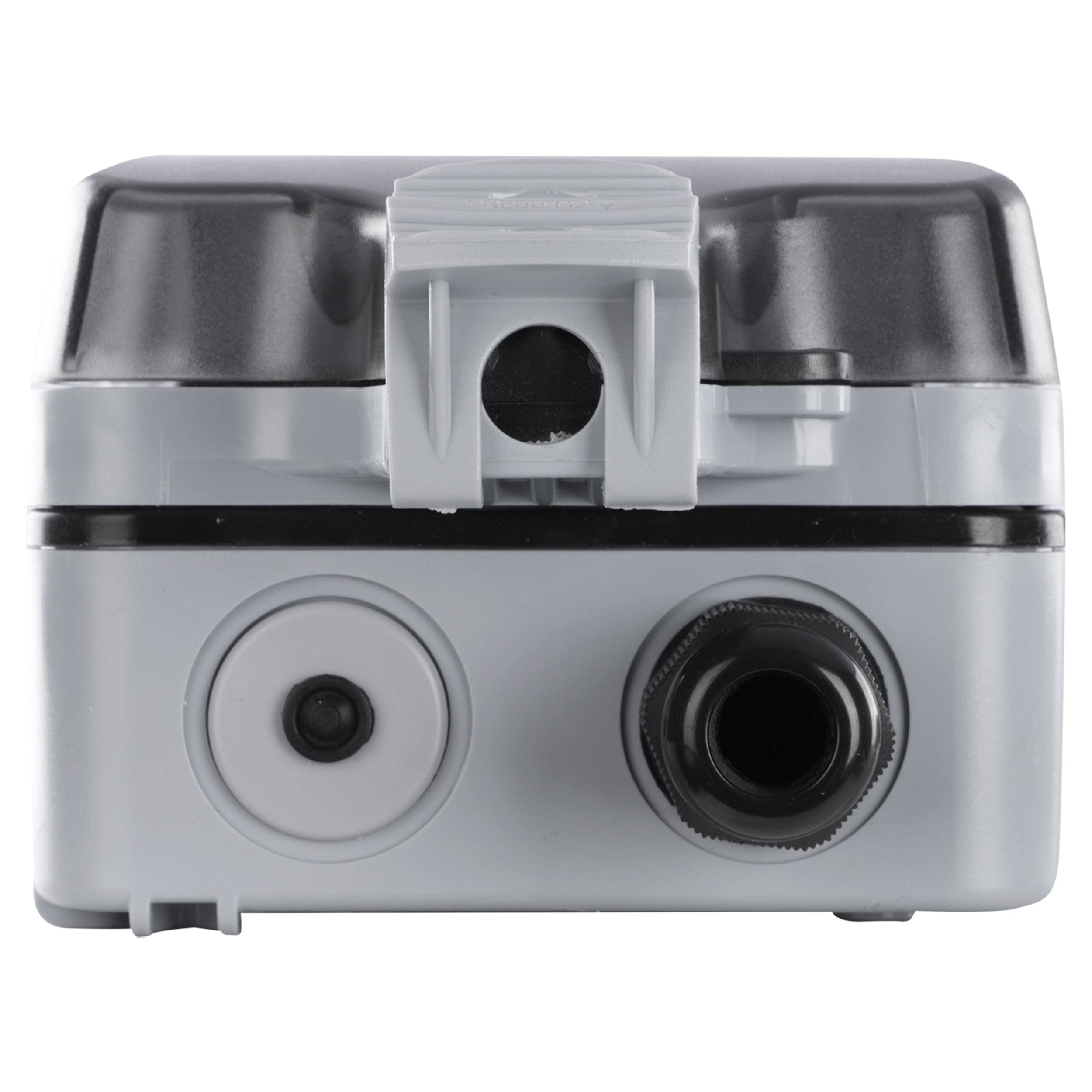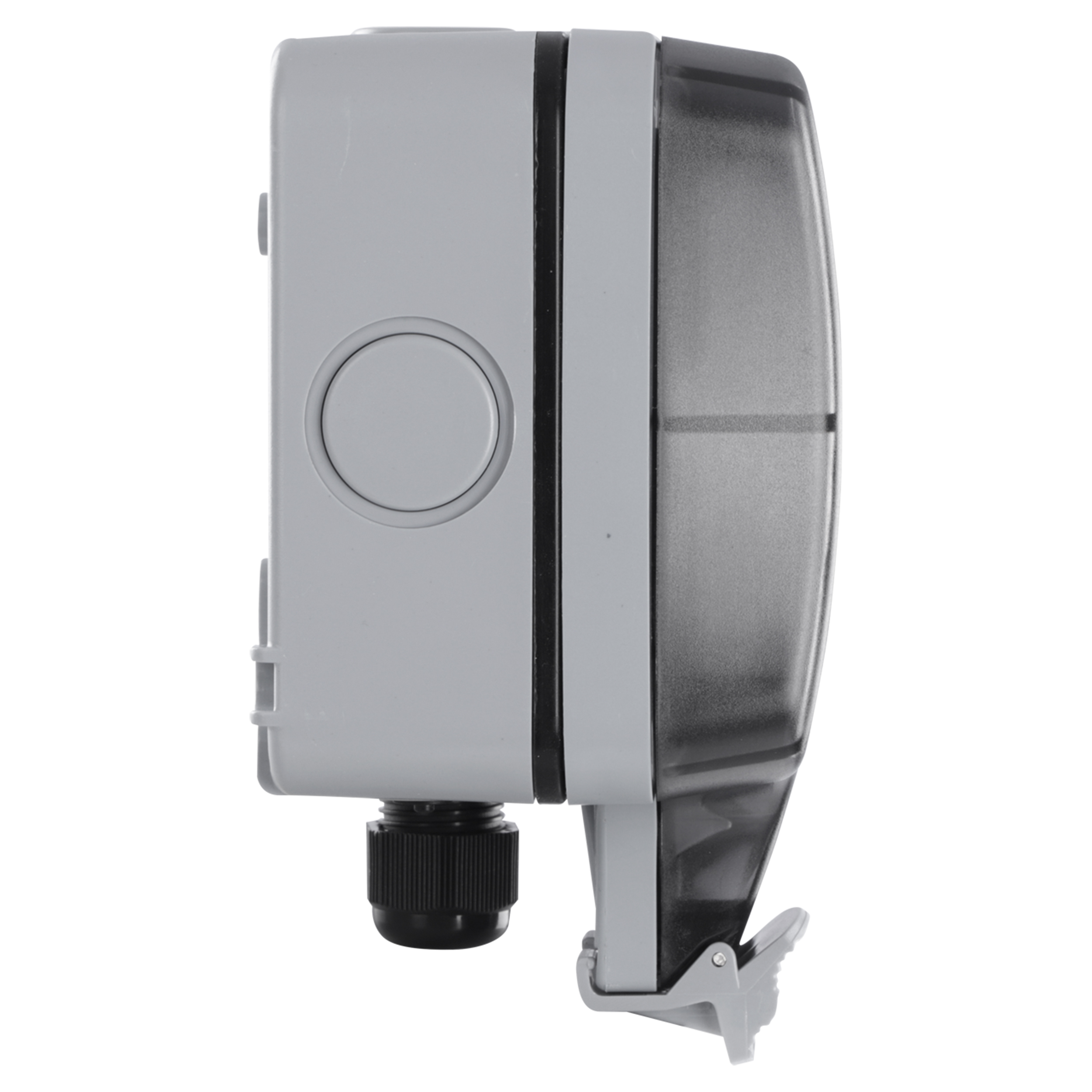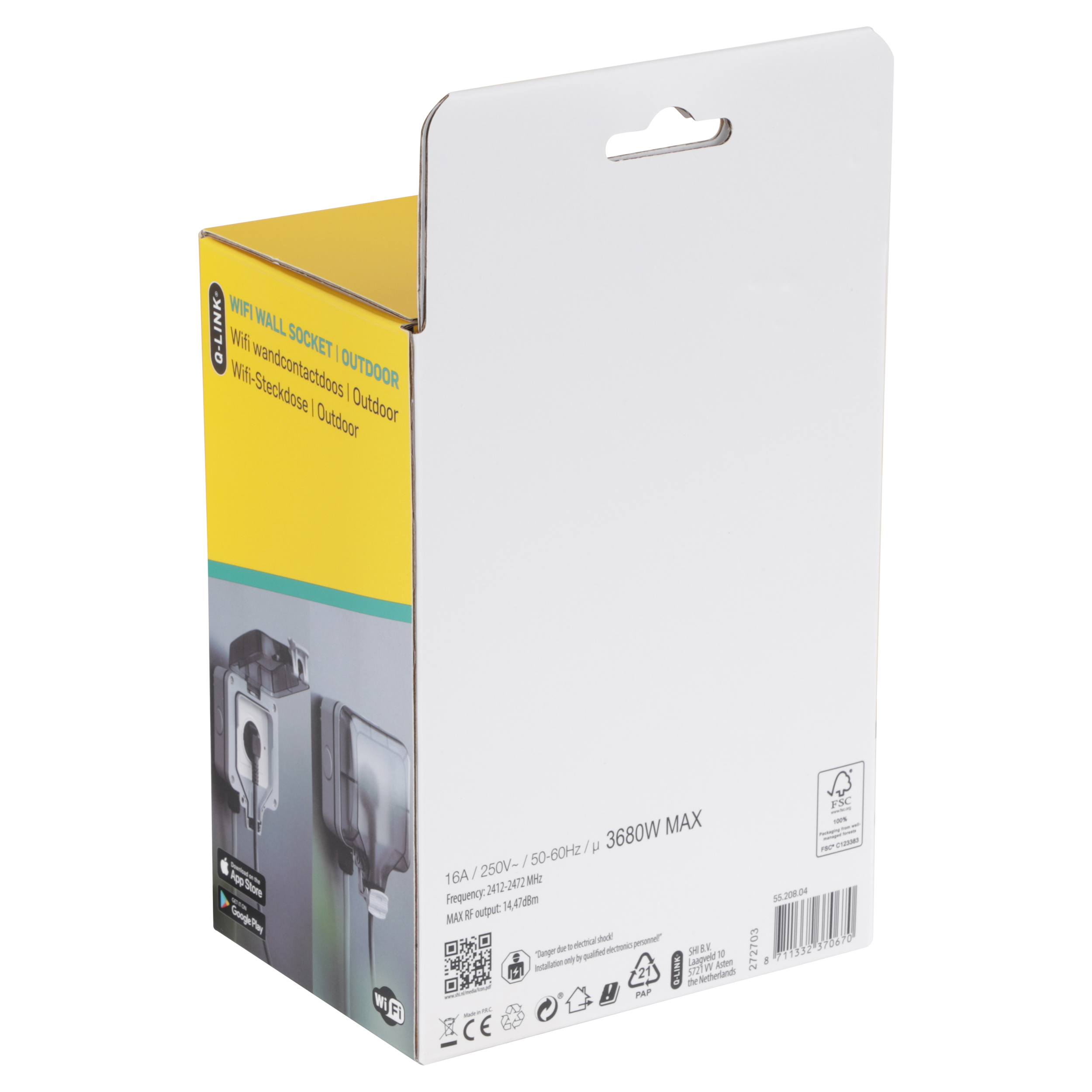 Wi-Fi wandcontactdoos in kleur grijs. Voor buitengebruik. Bevat één stopcontact met randaarde. Van een afstand te bedienen met app. IP66-geclassificeerd en dus bestand tegen stof en waterstralen. Maximaal vermogen van 3680W. Maximale stroomsterkte van 16A.