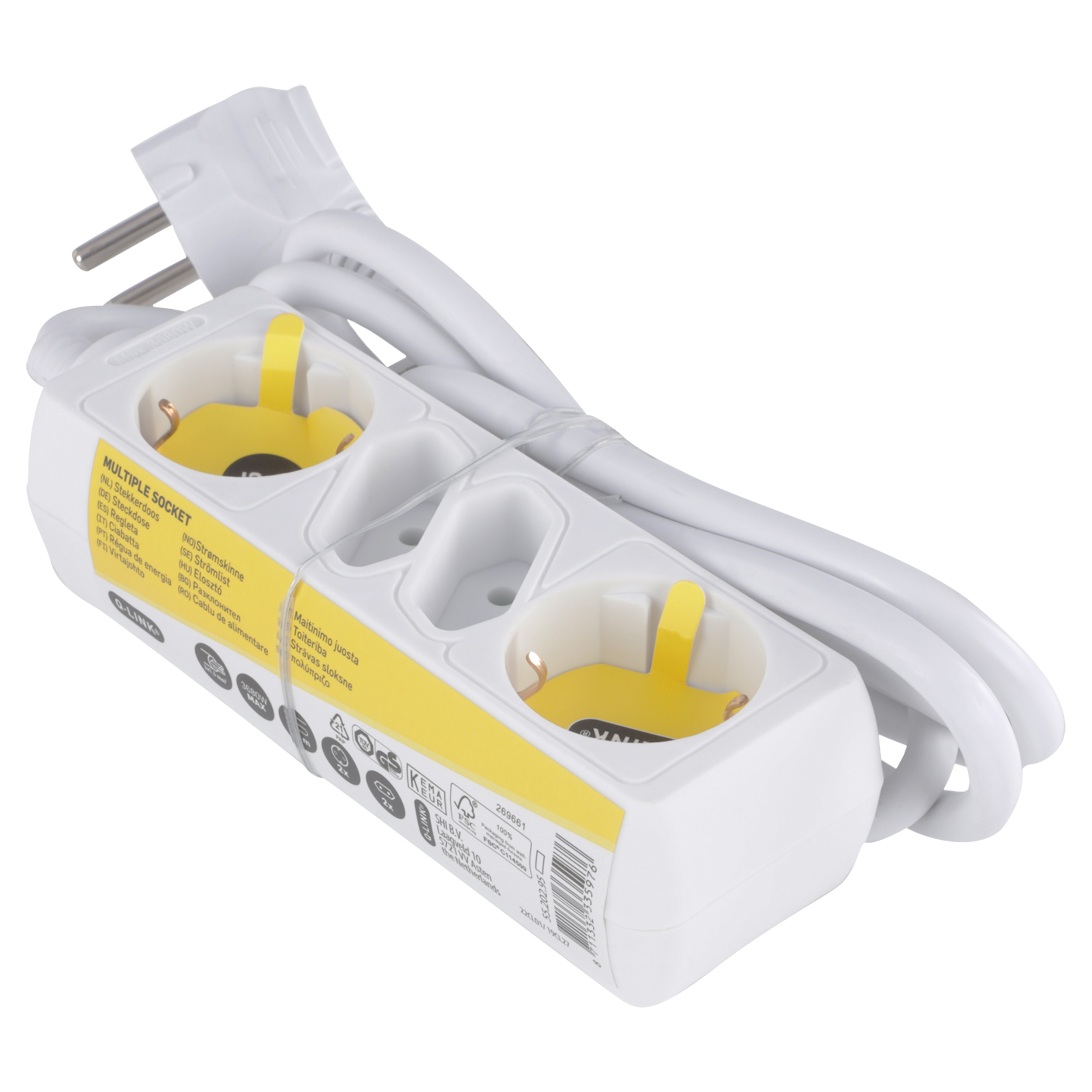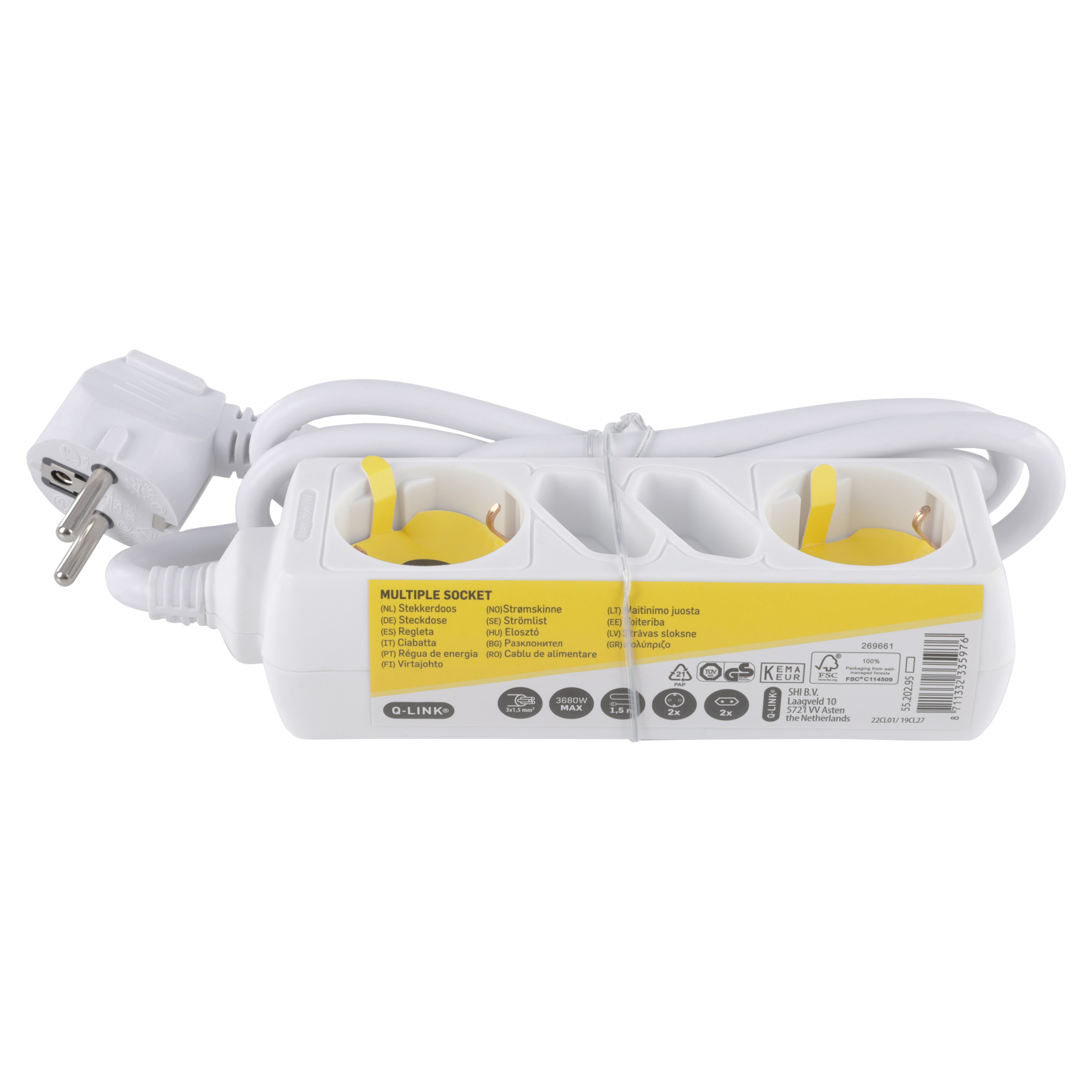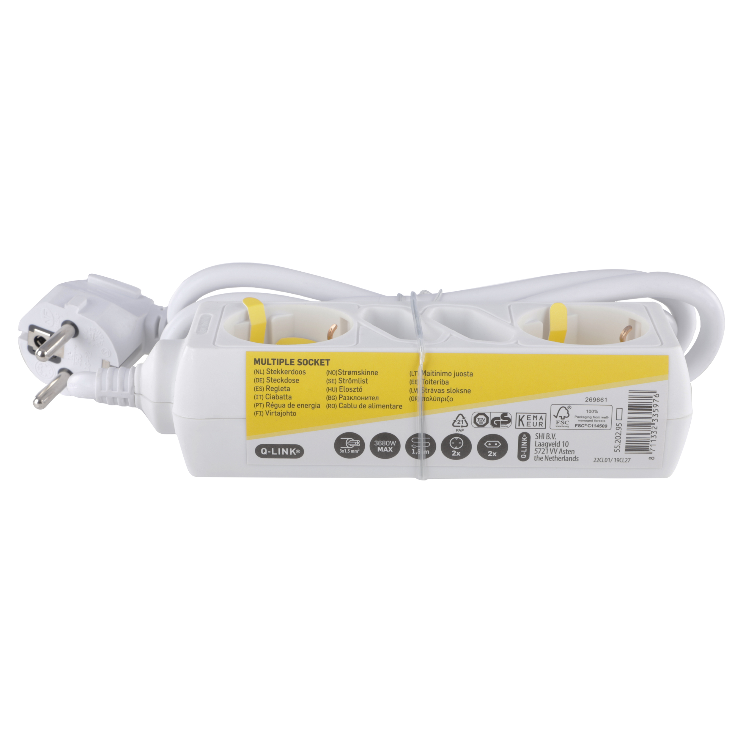 Witte stekkerdoos 4-voudig. Met 2 x randaarde stopcontact. Met 2 x Euro stopcontact. Maximaal 3680 Watt. Vinyl kabel 1.5 meter, 3 x 1.5 mm².