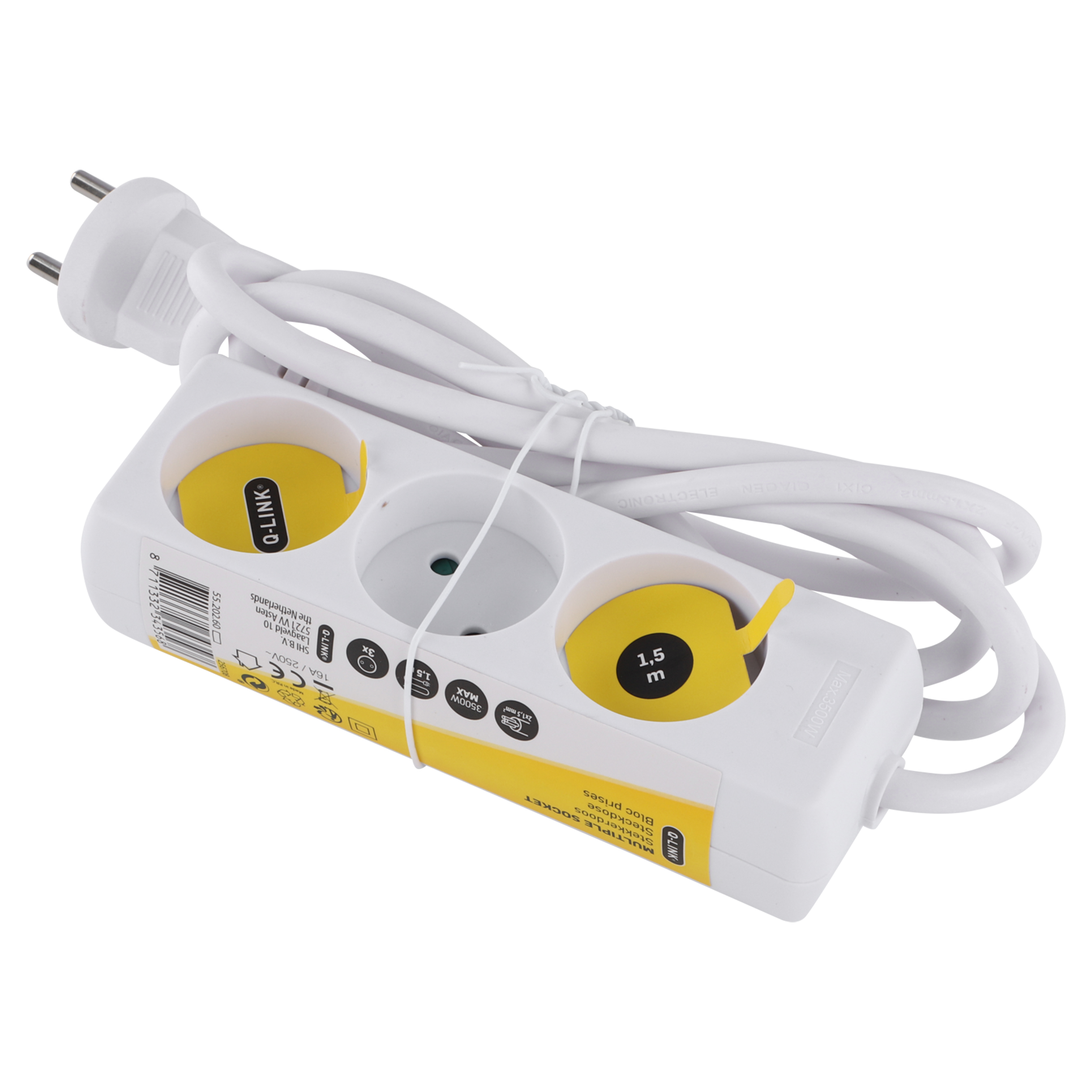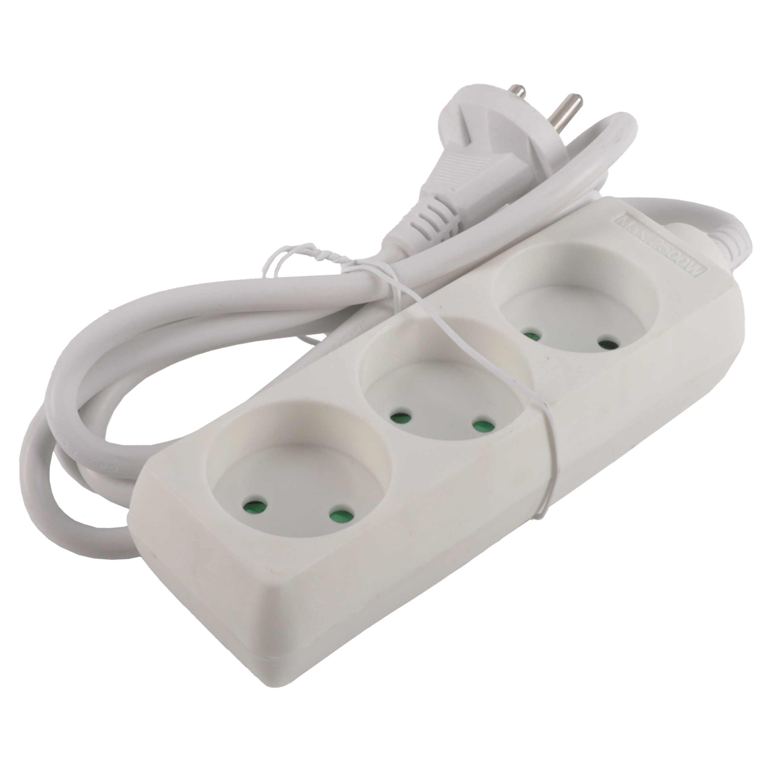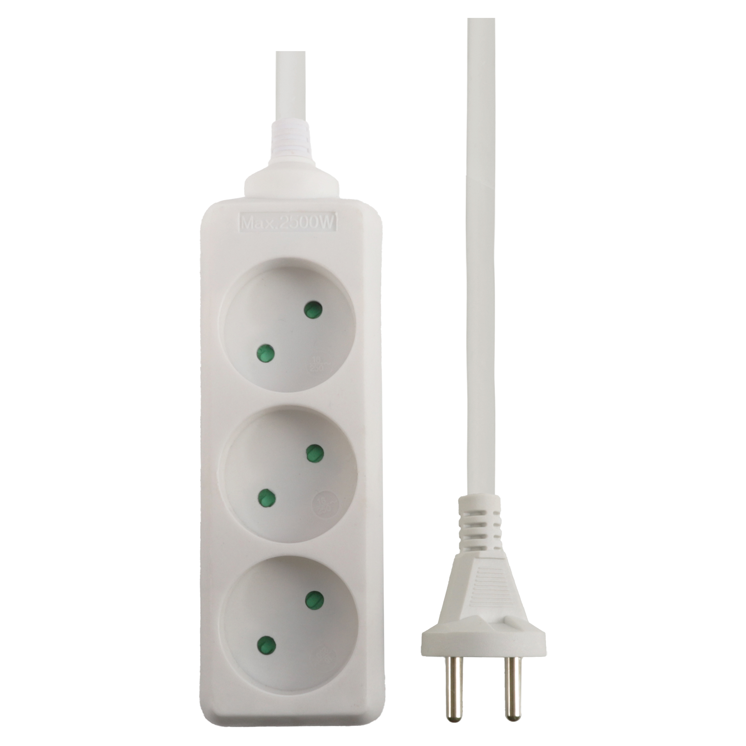 Witte stekkerdoos 3-voudig. Zonder randaarde. Maximaal 3500 Watt. Vinyl kabel 1.5 meter, 2 x 1.5 mm².