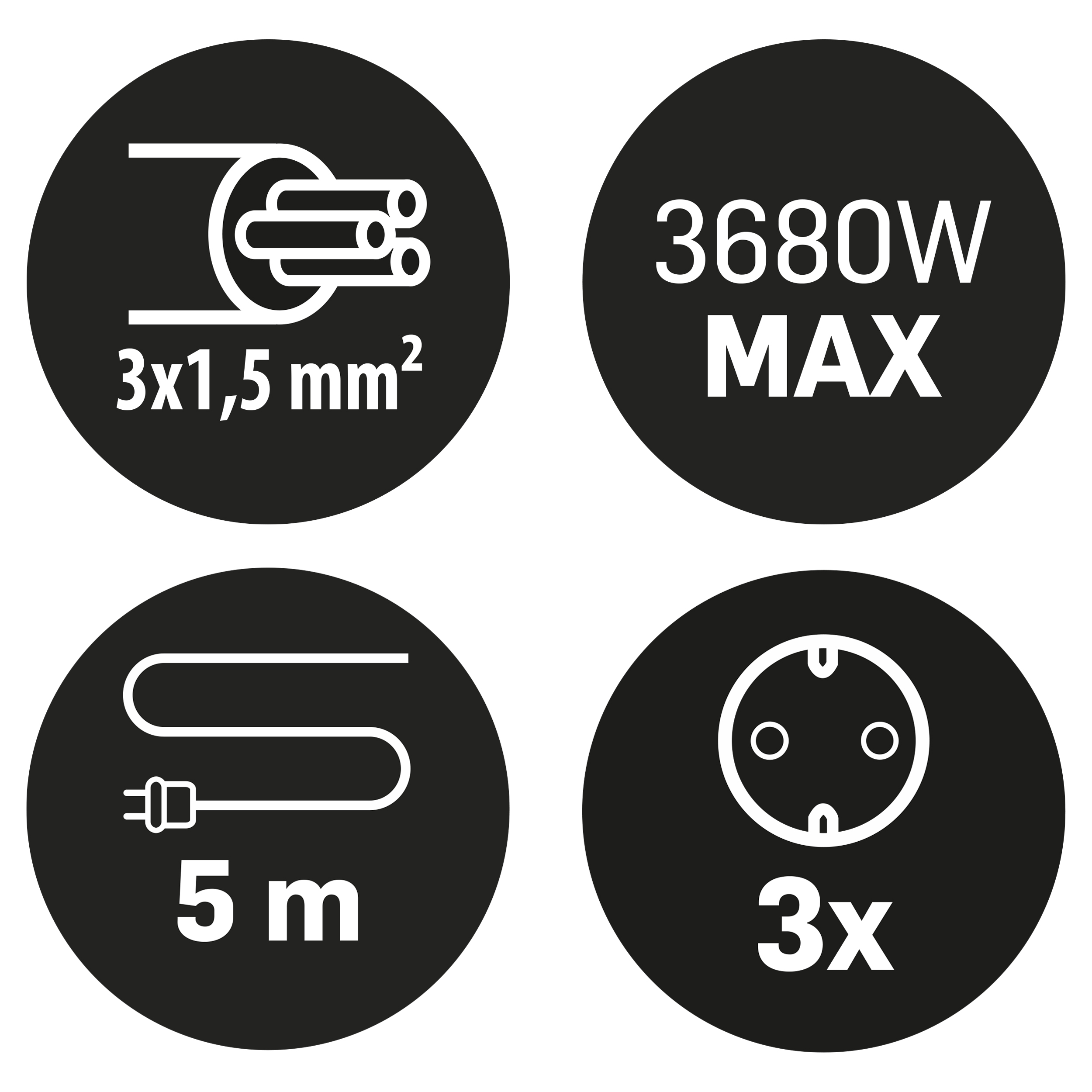 Witte stekkerdoos 3-voudig. Met randaarde. Maximaal 3680 watt. Vinyl kabel 5 meter, 3 x 1.5 mm².