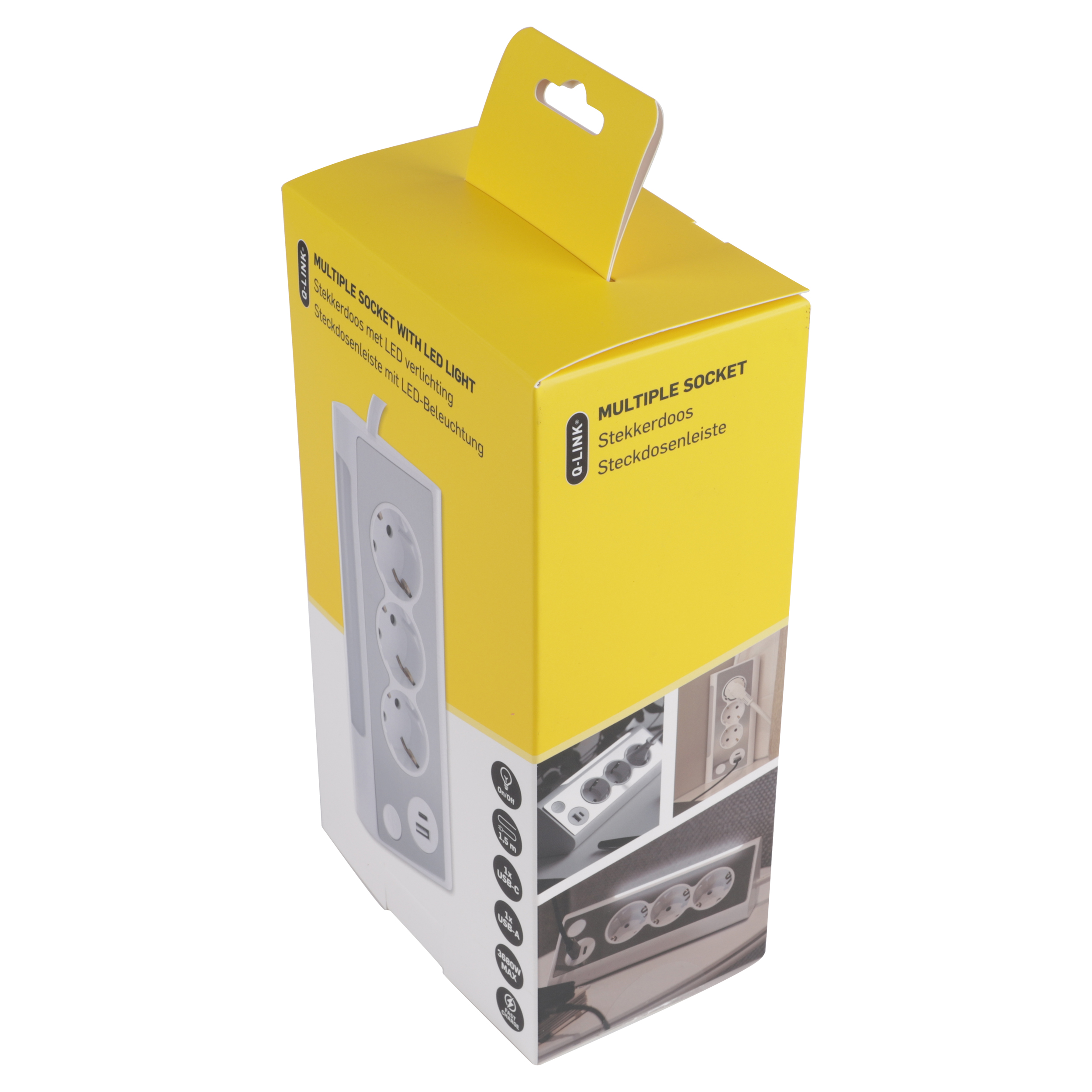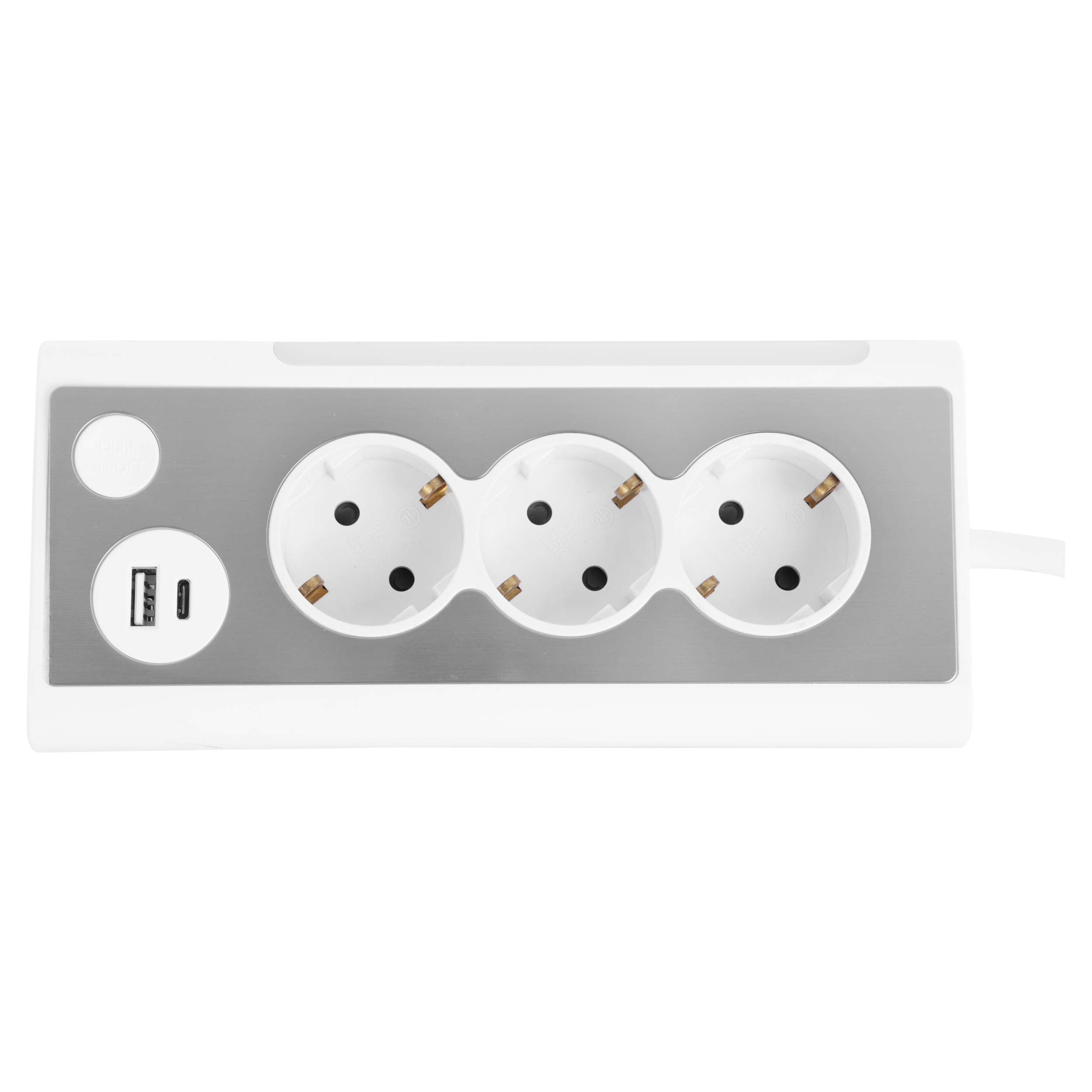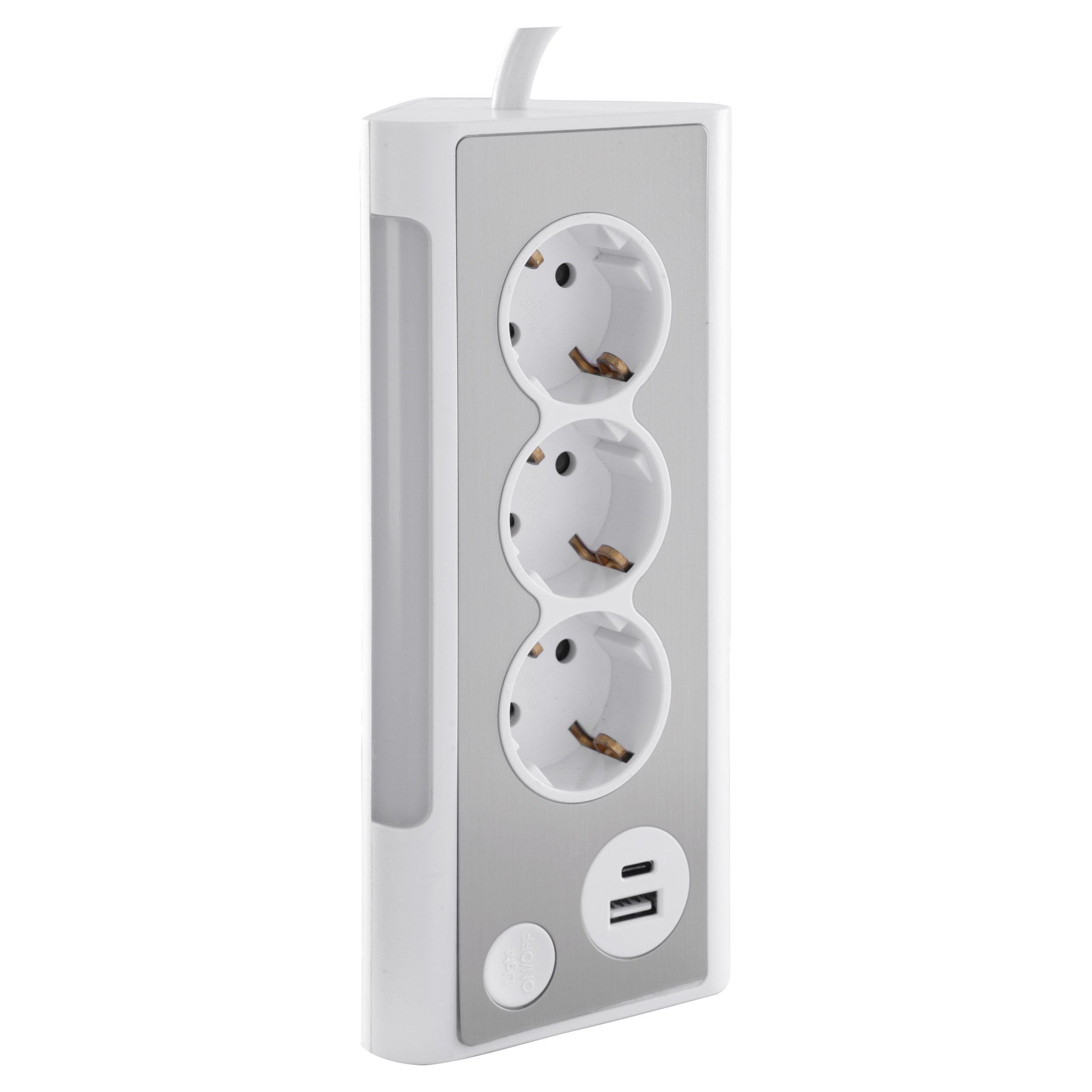 Stekkerdoos 3-voudig met LED verlichting in de kleur wit/grijs. Met schakelaar om de verlichting aan- en uit te zetten. Met randaarde. De stekkerdoos beschikt over drie stopcontacten, één USB-A en één USB-C aansluiting. Met “fast charge” om mobiele apparaten snel en efficiënt opladen. Maximaal 3680 watt. Vinyl kabel 1.5 meter, 3 x 1.5 mm².