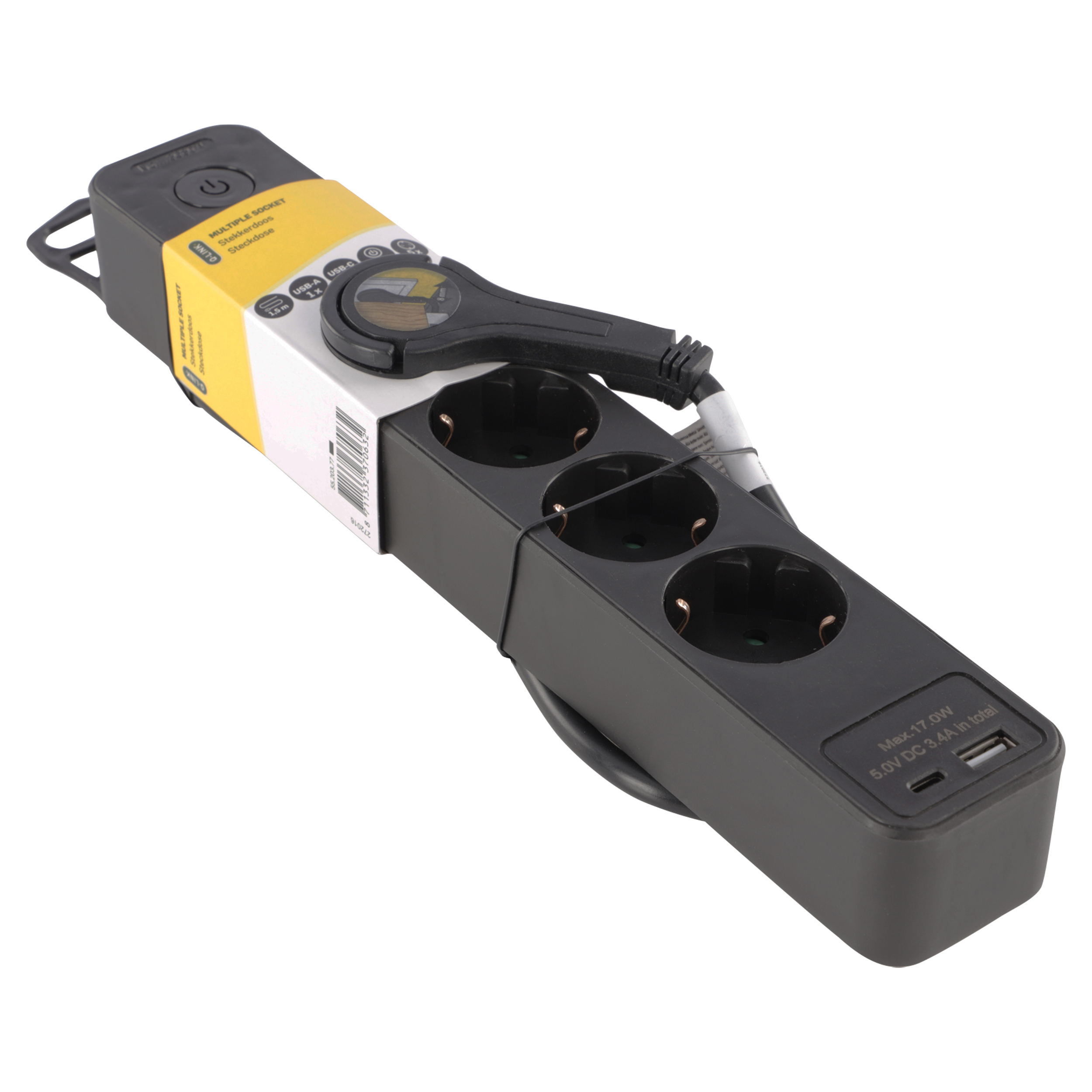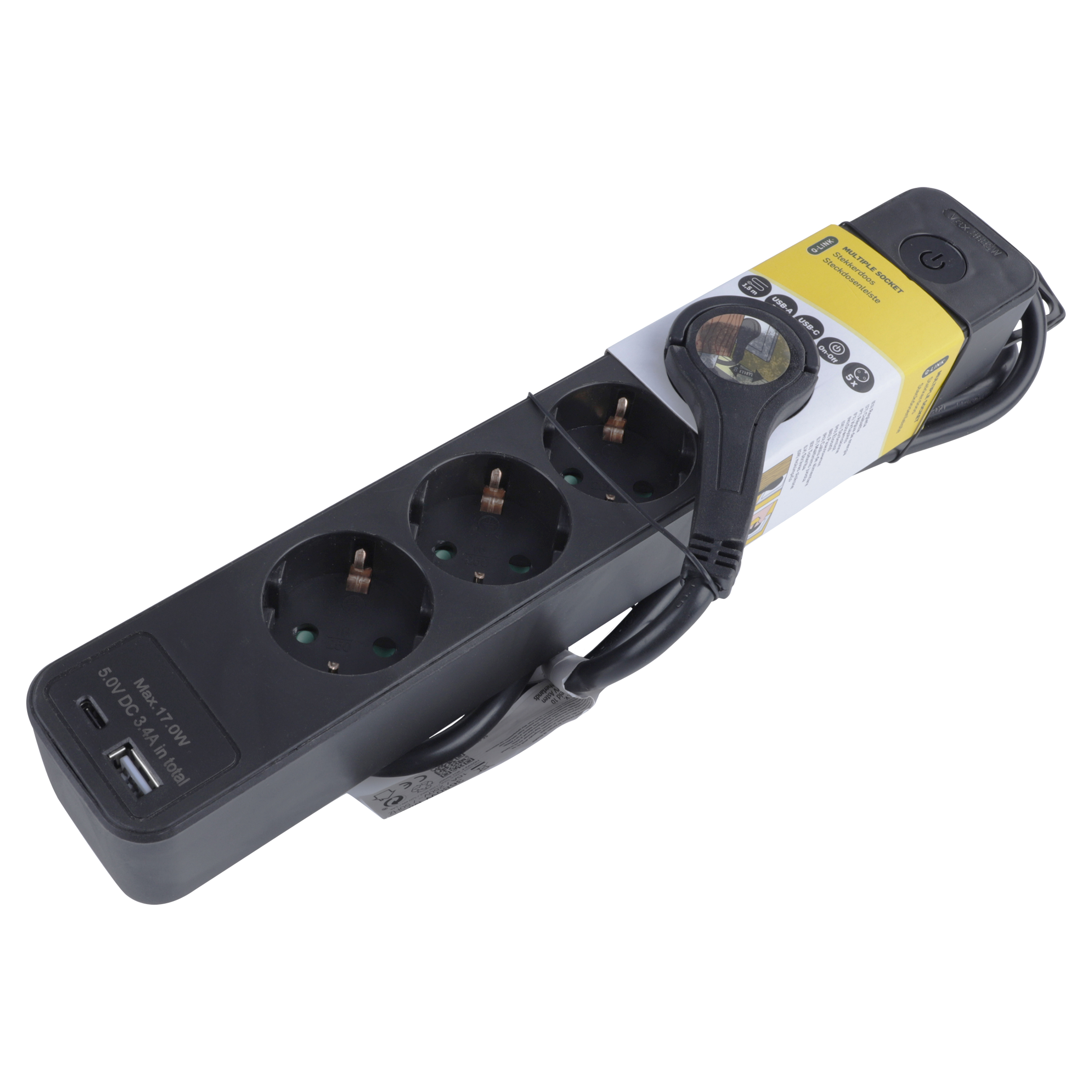 Zwarte 5-voudige stekkerdoos. Met een platte stekker van 8 mm. Met 2 ingebouwde USB-poorten (1x USB A en 1x USB C). Beoordeelde output van 17,0W MAX / 3,4A – 5.0V DC voor snelle en efficiënte oplaadtijden. Vinyl kabel 1.5 m, 3 x 1.5 mm². Maximaal 3680 Watt. Met schakelaar.