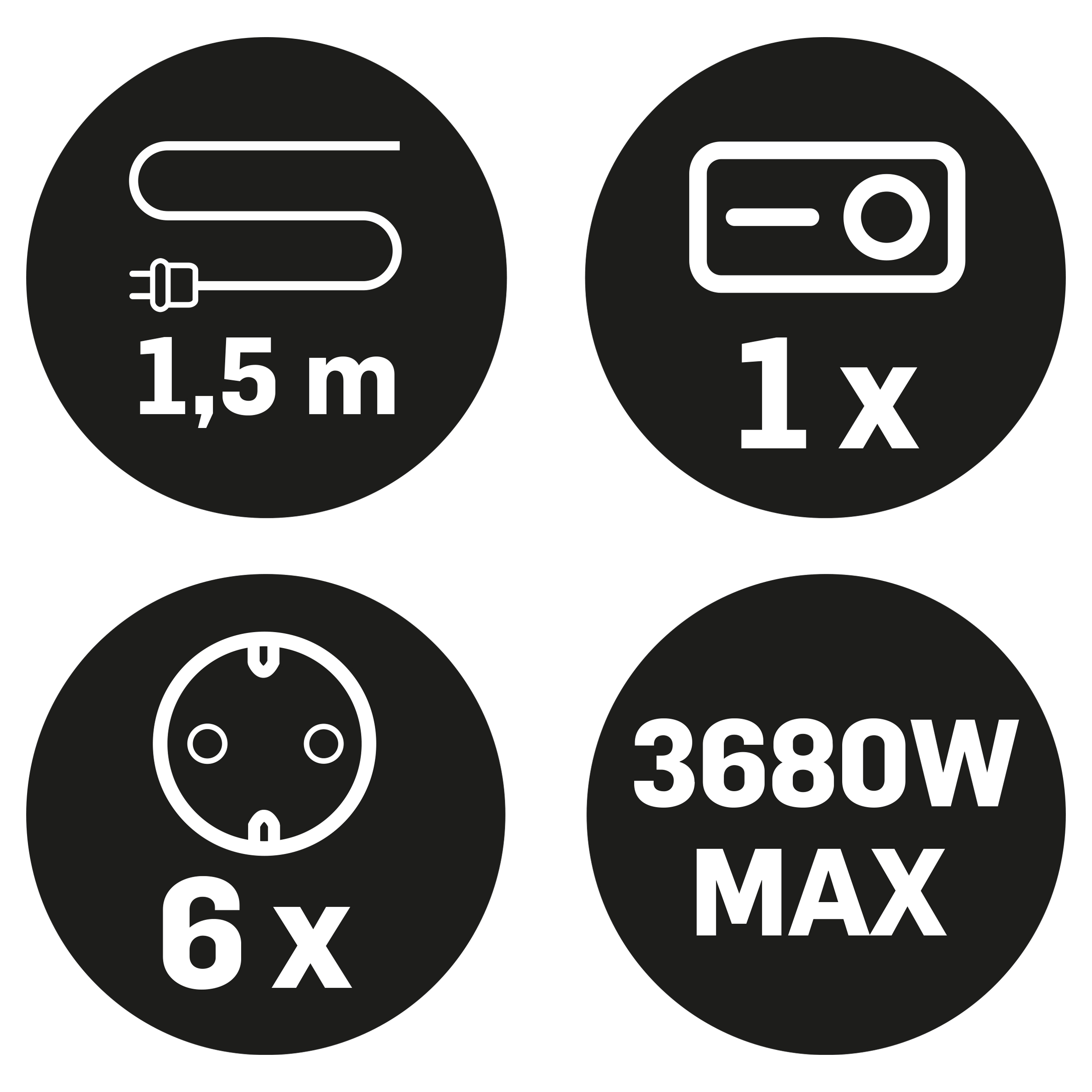 Witte 6-voudige stekkerdoos. Met een platte stekker van 8 mm is deze ideaal voor achter een kast of audiomeubel. Met randaarde. Alleen voor binnengebruik in droge ruimten. Alleen voor huishoudelijke apparaten. Vinyl kabel 1.5 m, 3 x 1.5 mm². Maximaal 3680 Watt. Met schakelaar.