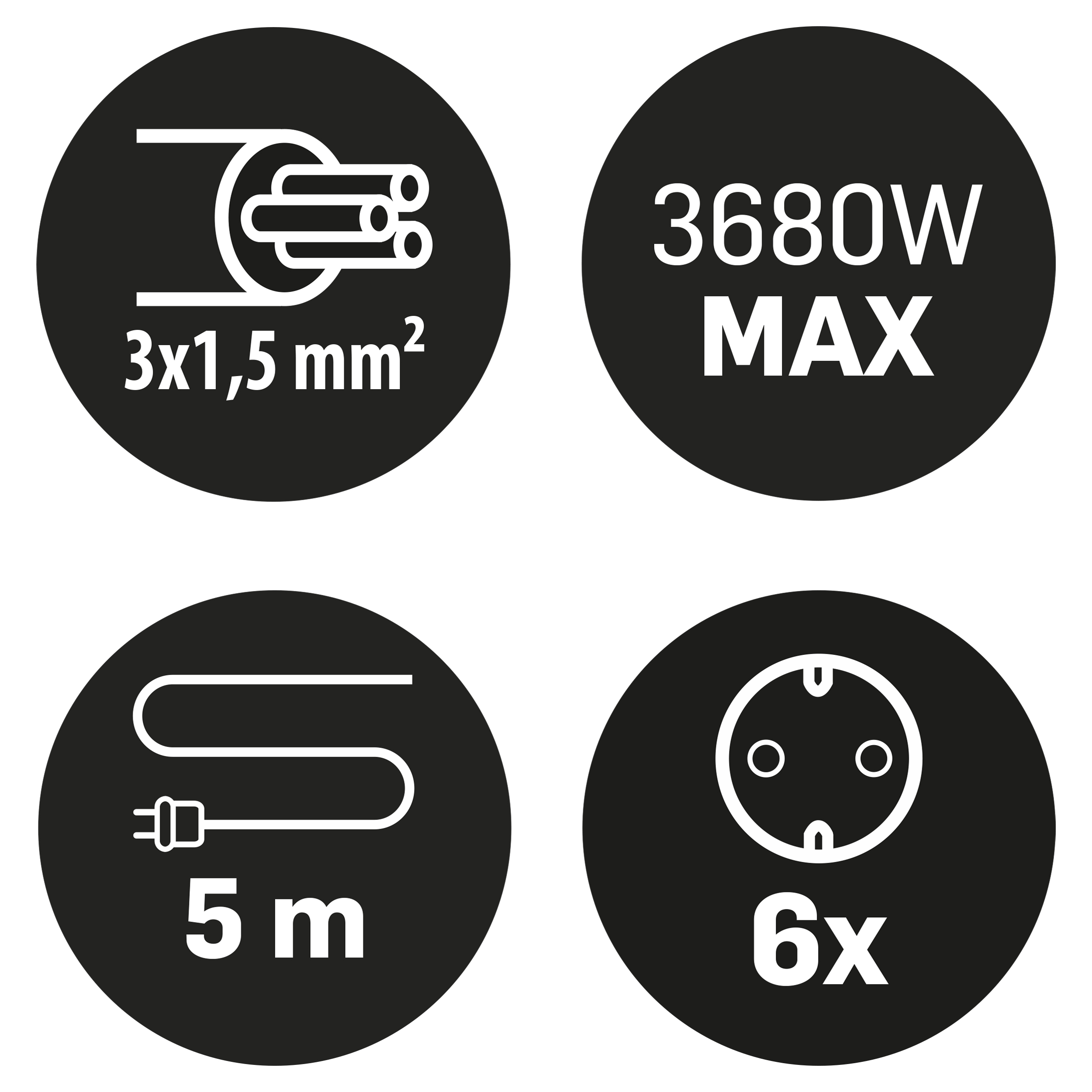 Witte stekkerdoos 3-voudig. Met randaarde. Maximaal 3680 watt. Vinyl kabel 5 meter, 3 x 1.5 mm².