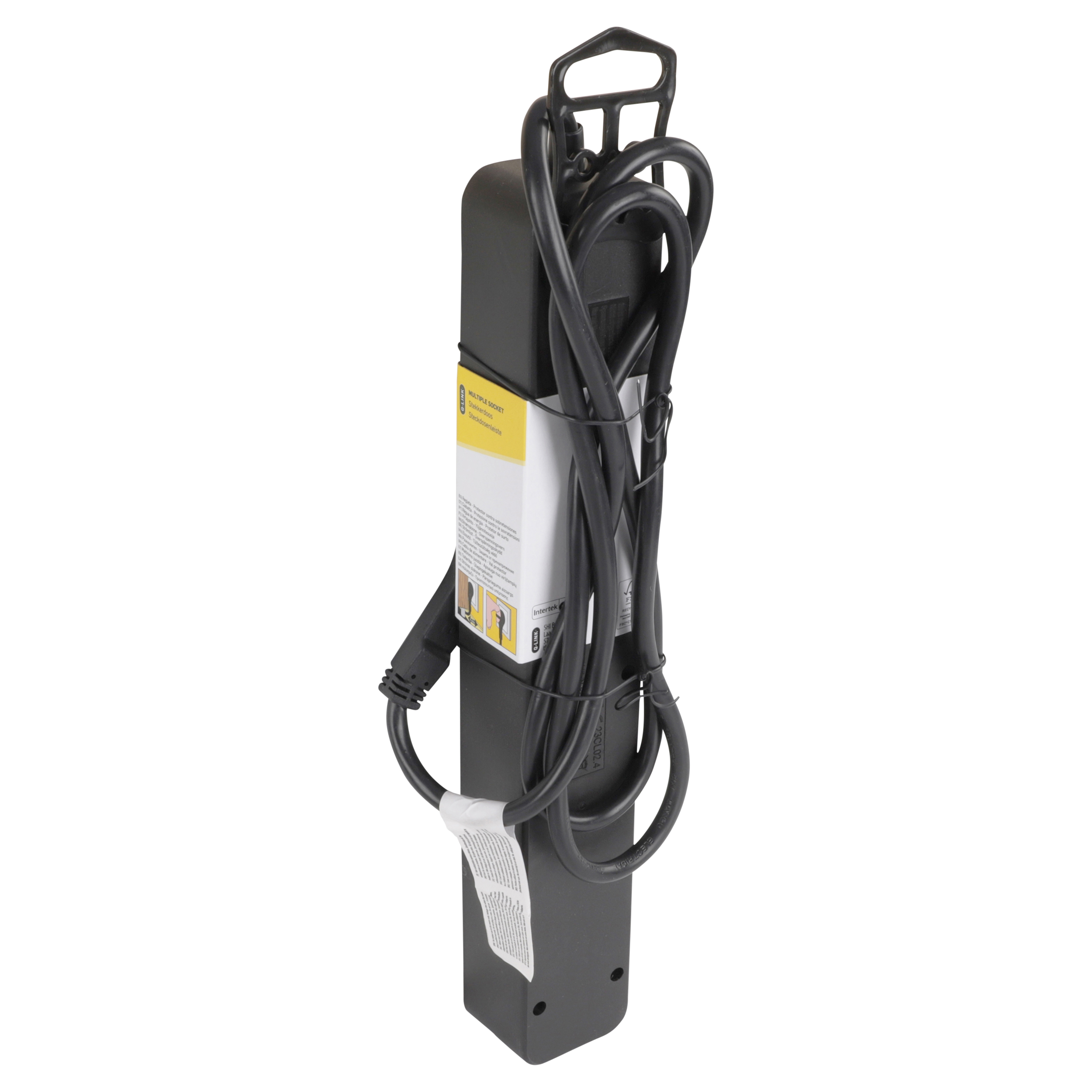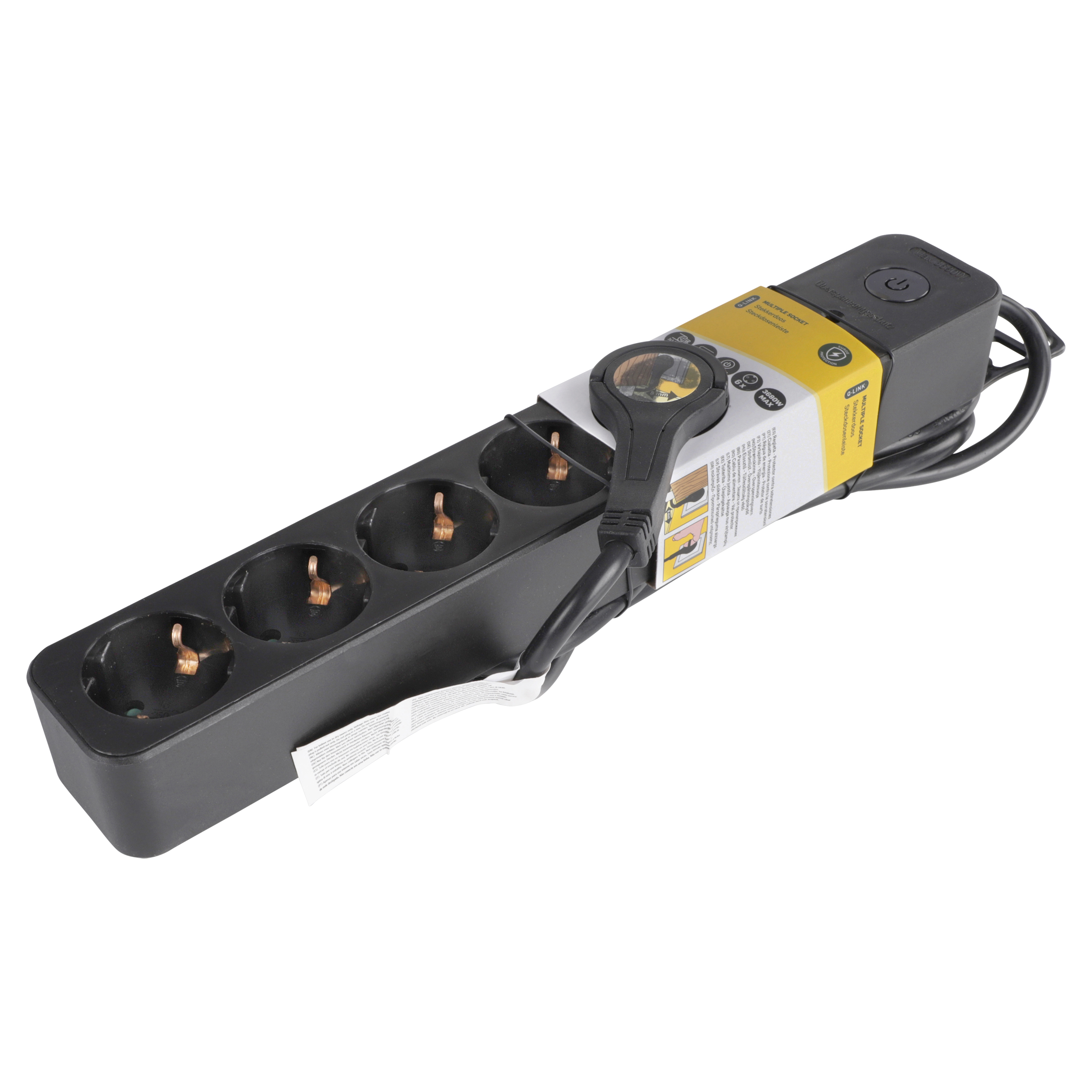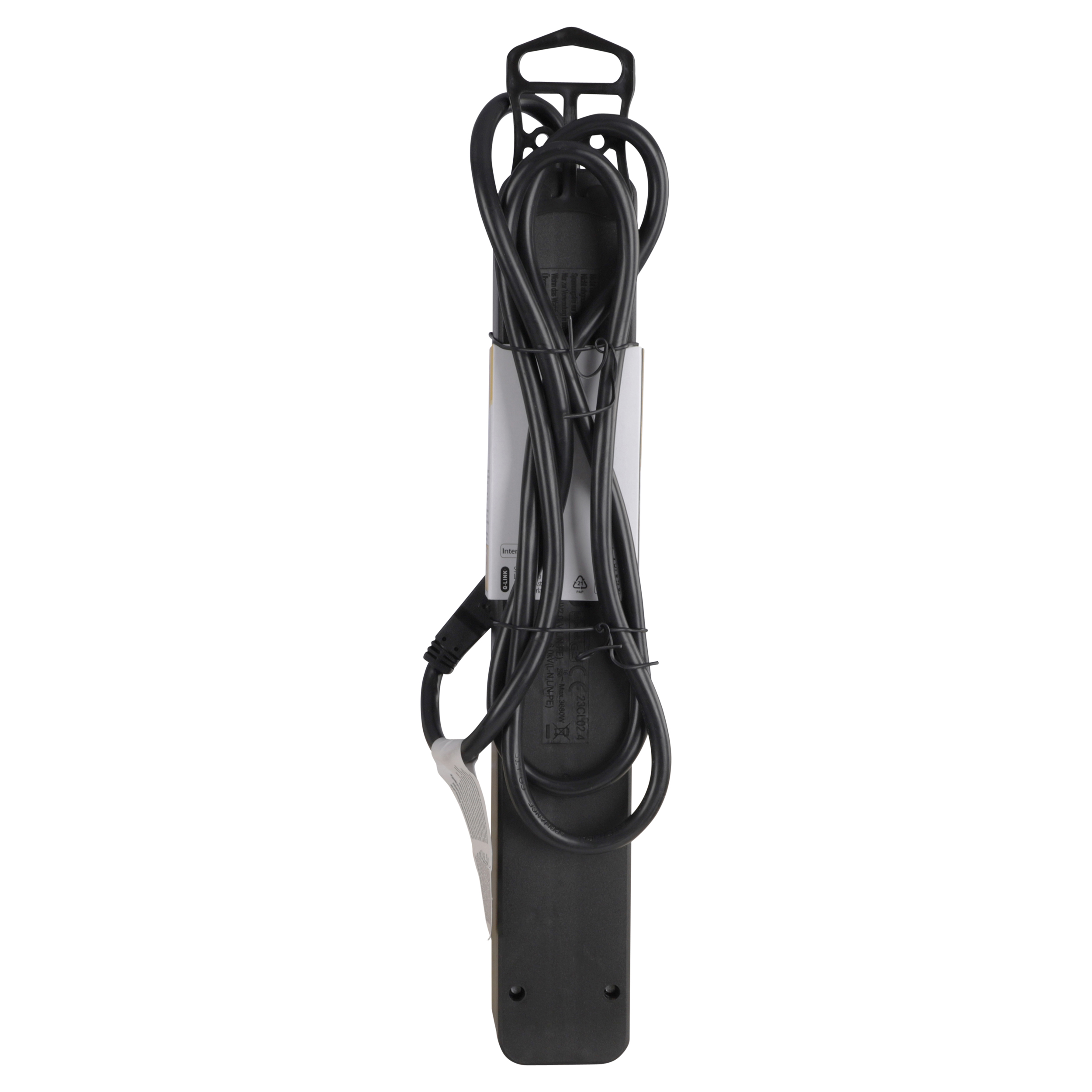 Zwarte 6-voudige stekkerdoos. Met schakelaar. Met ingebouwde overspanningsbeveiliging tegen stroompieken. Met een platte stekker van 8 mm. Vinyl kabel 1.5 meter, 3 x 1,5 mm². Maximaal vermogen: 3680 watt.