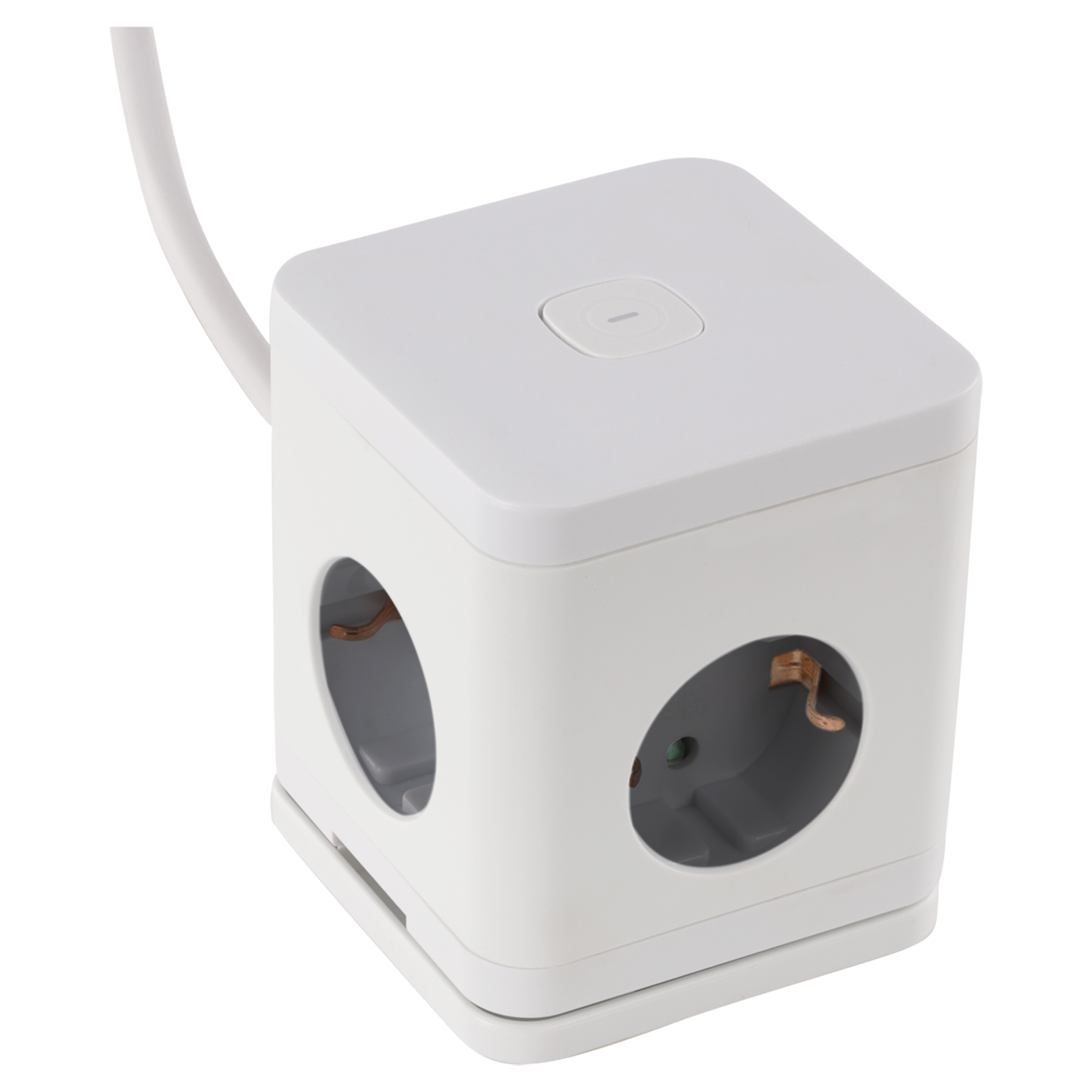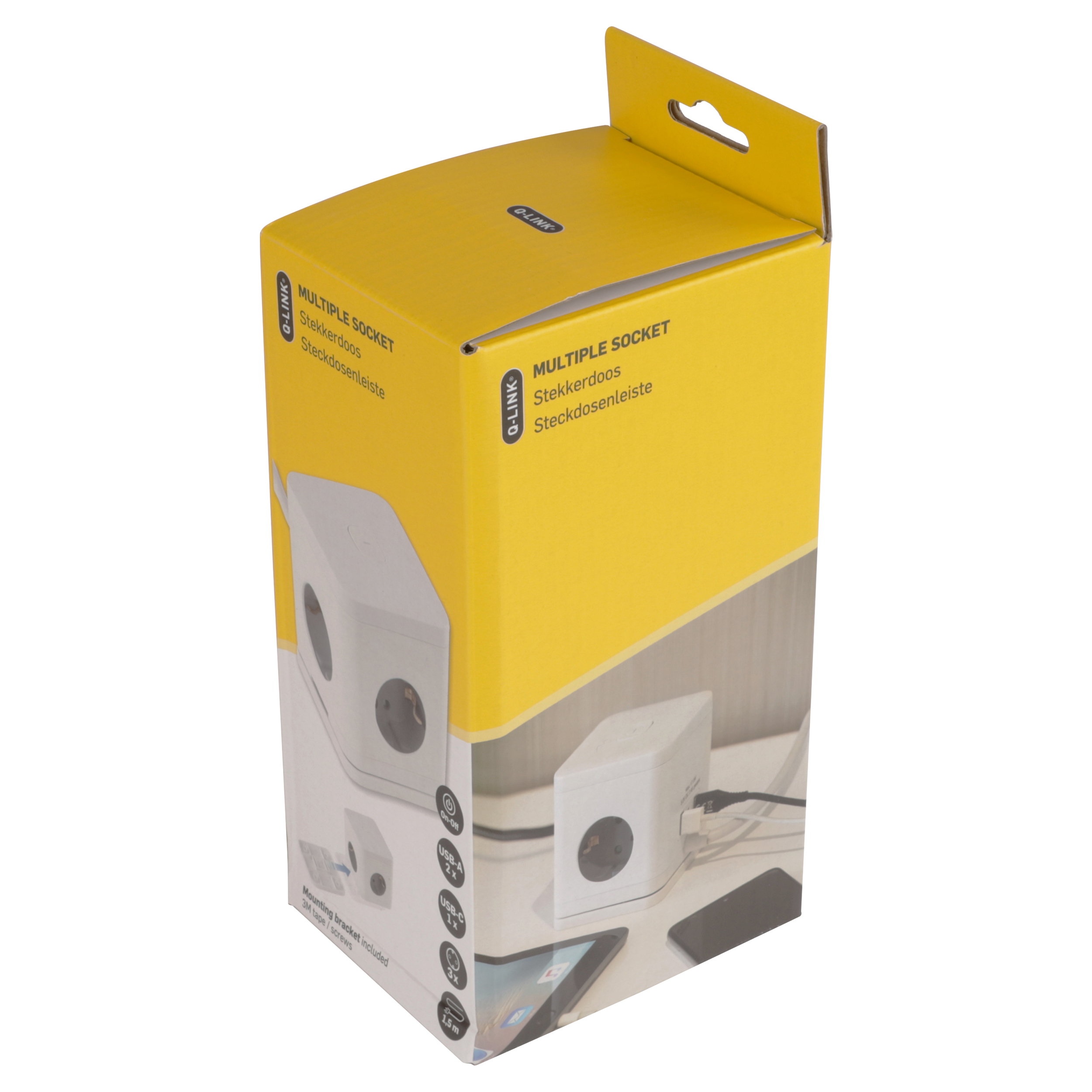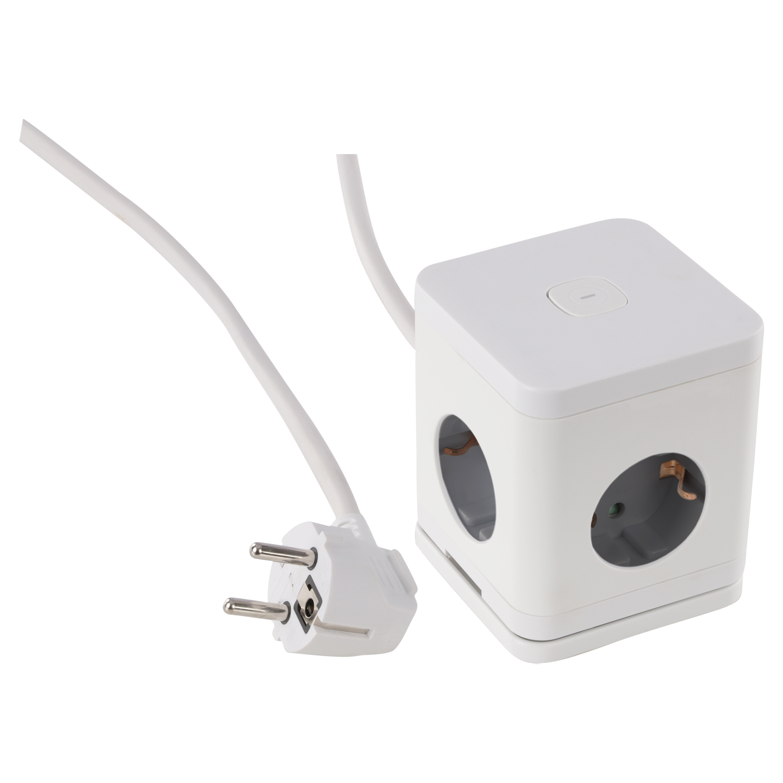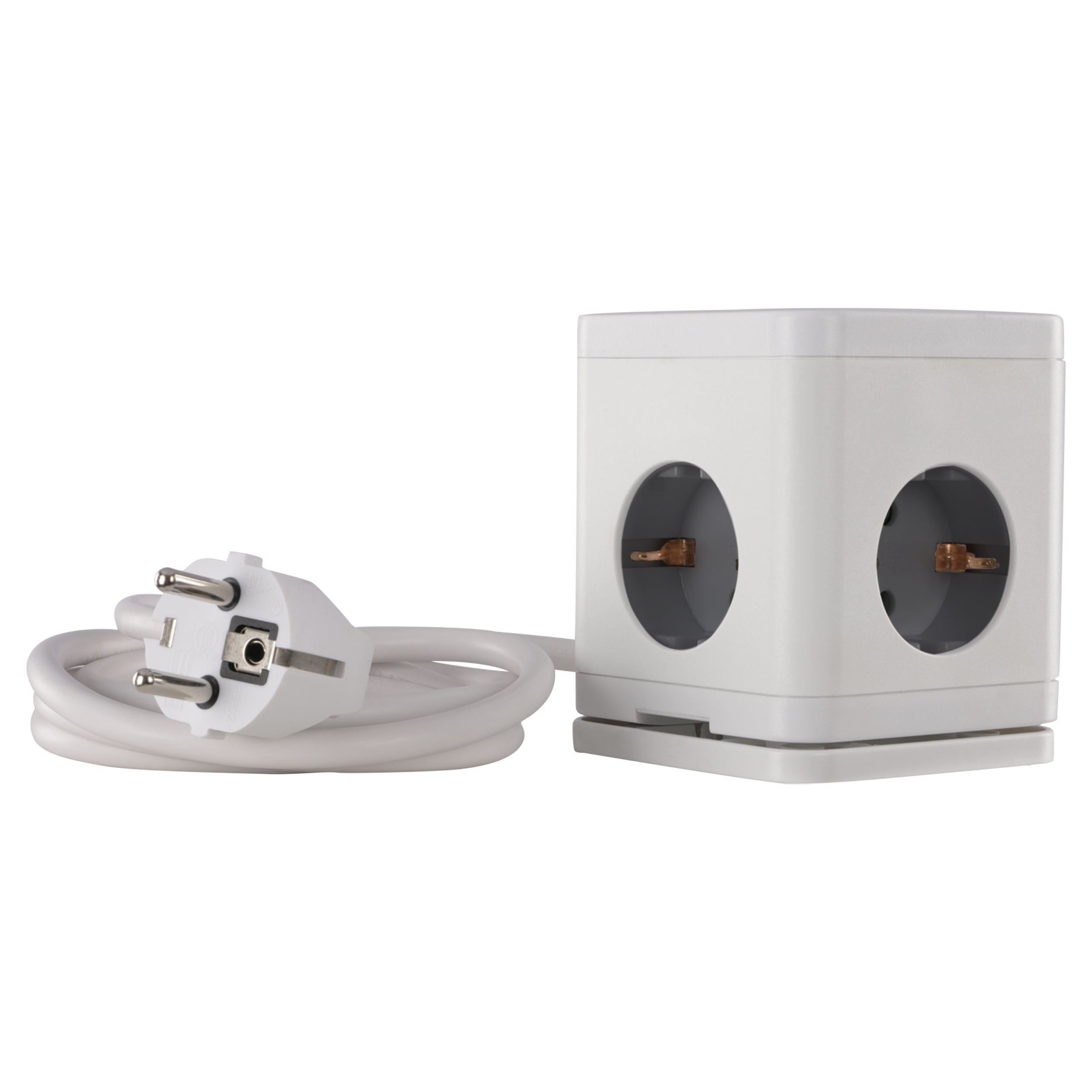 4-voudige verdeelstekker in de kleur wit/grijs. Kubusvormig model. Met randaarde en schakelaar. Beschikt over vier stopcontacten, twee USB-A-poorten en één USB-C-poort. Maximaal 3680 watt. Kabellengte 1.5 meter, kabeldikte 3 x 1.5 mm². Tape en schroeven meegeleverd.
