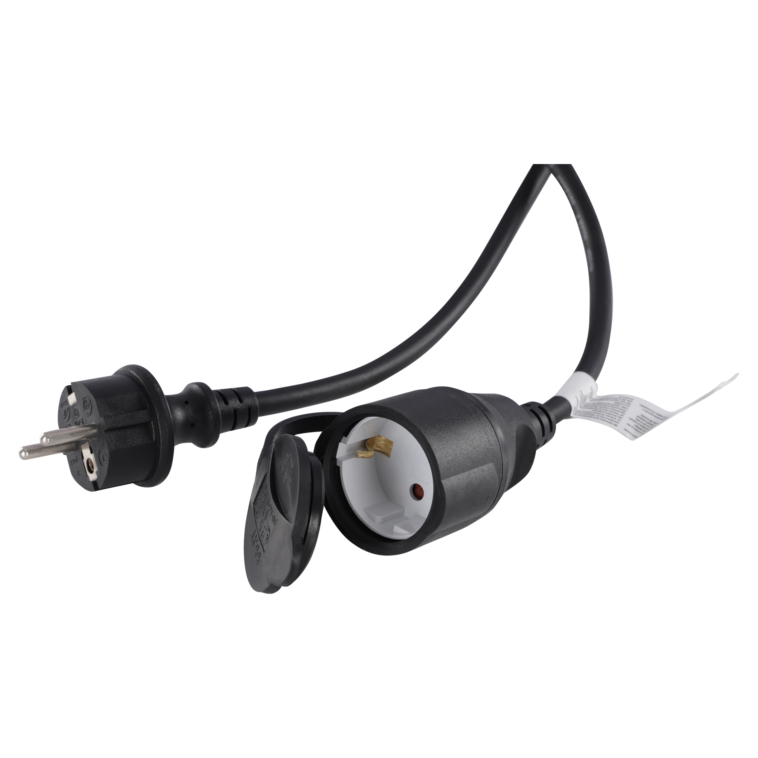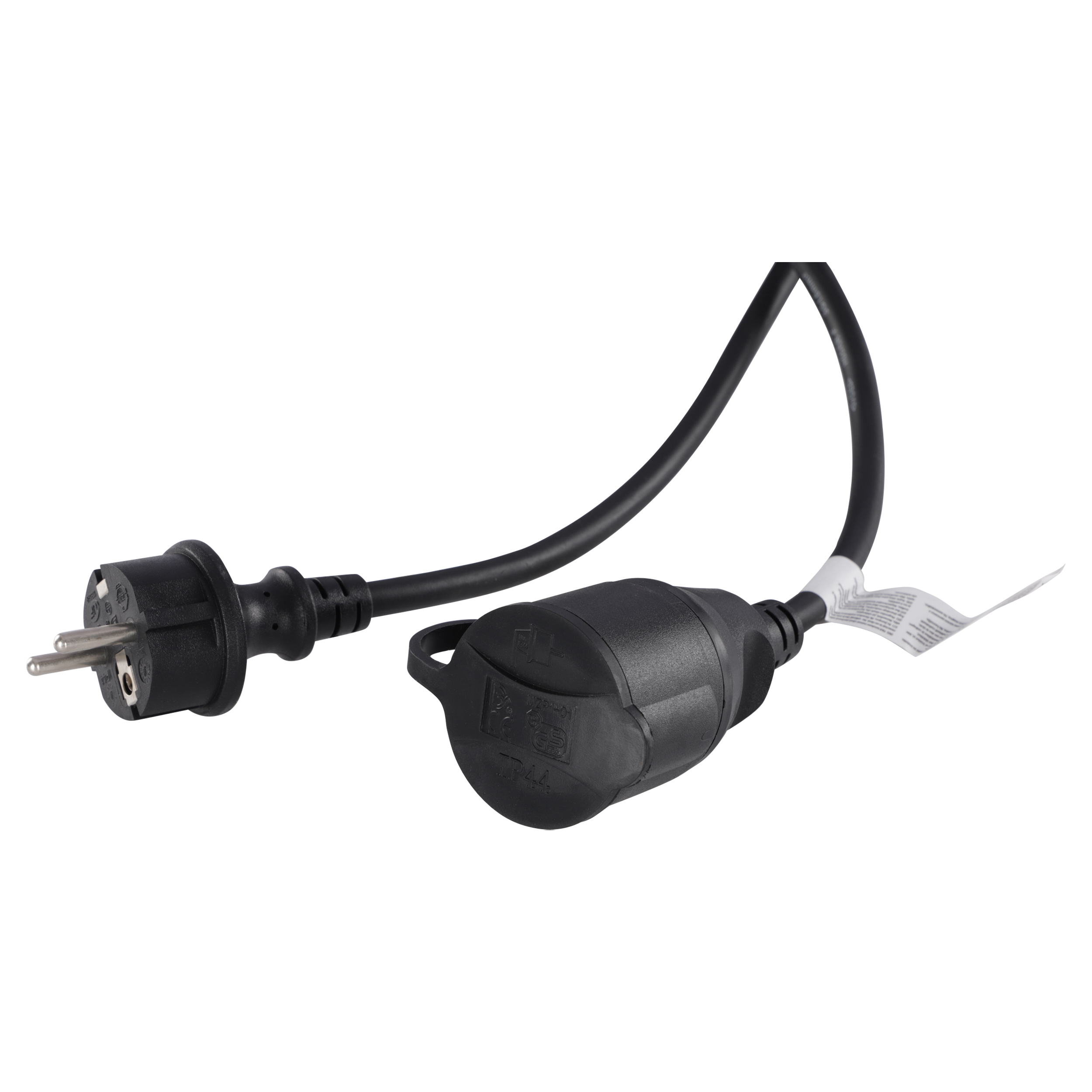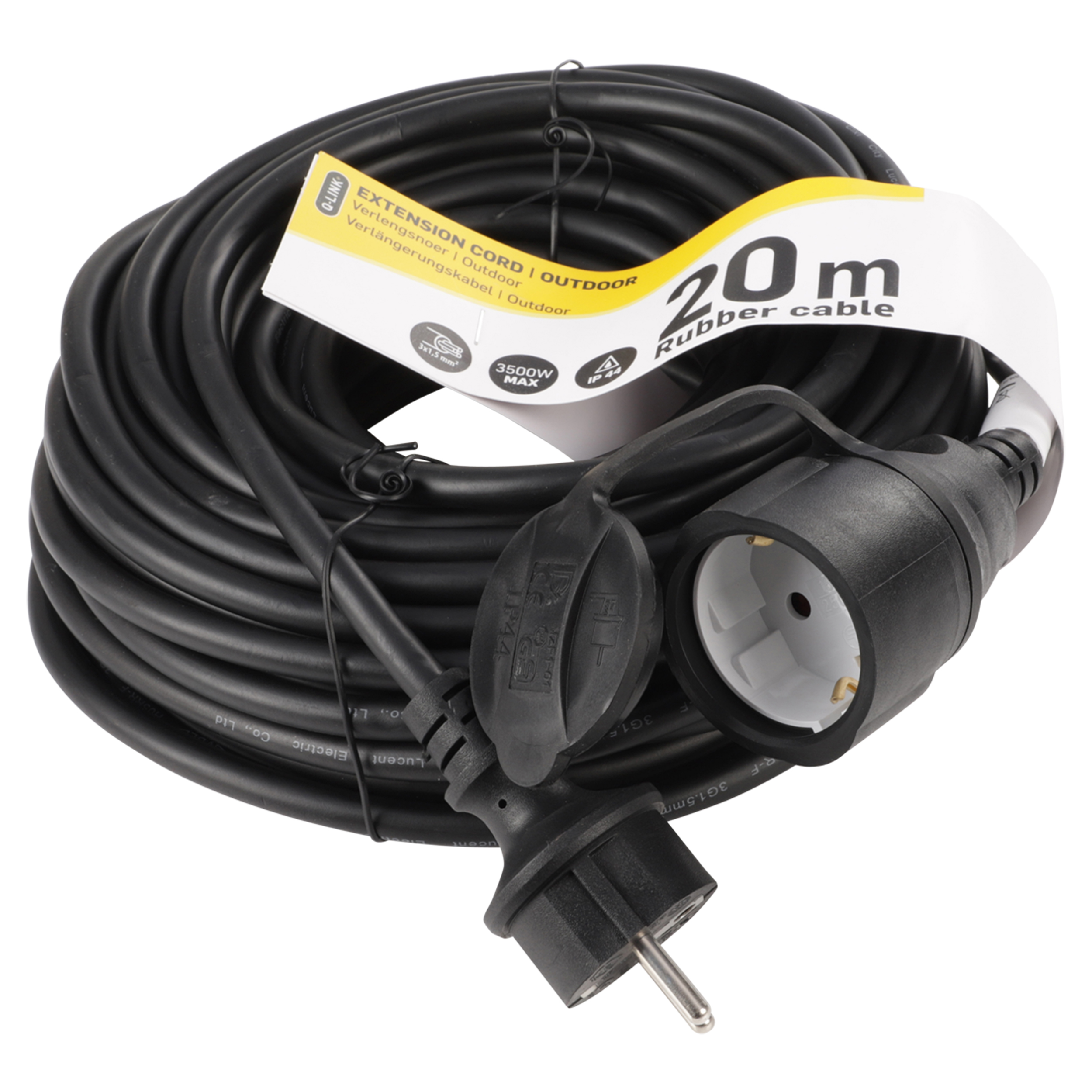 Verlengsnoer in de kleur zwart voor buitengebruik. Met randaarde. De neopreenkabel heeft een lengte van 20 meter en een doorsnede van 3 x 1.5 mm². Spatwaterdicht (IP44). Maximaal vermogen van 3500W.